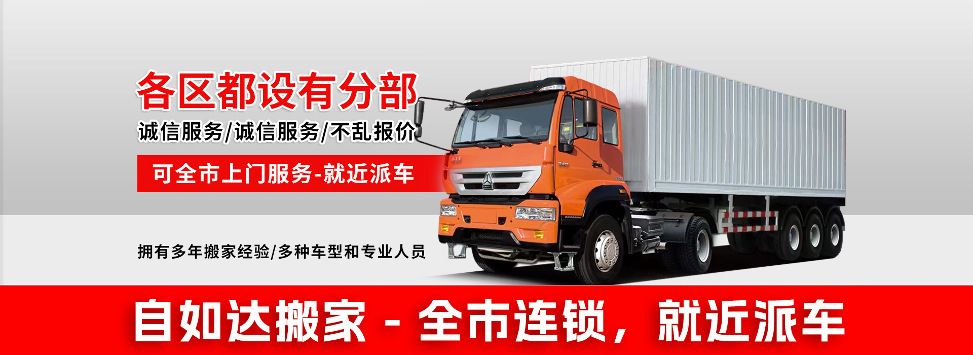 广州自如达搬家有限公司是较早在广州市成立的广州搬屋,广州搬家,搬厂,搬公司之一,现在广州各区已拥有数十家分部、各类大小车辆100余辆,职工300多名。公司管理严格,服务超值,拥有一大批高素质的优秀员工。